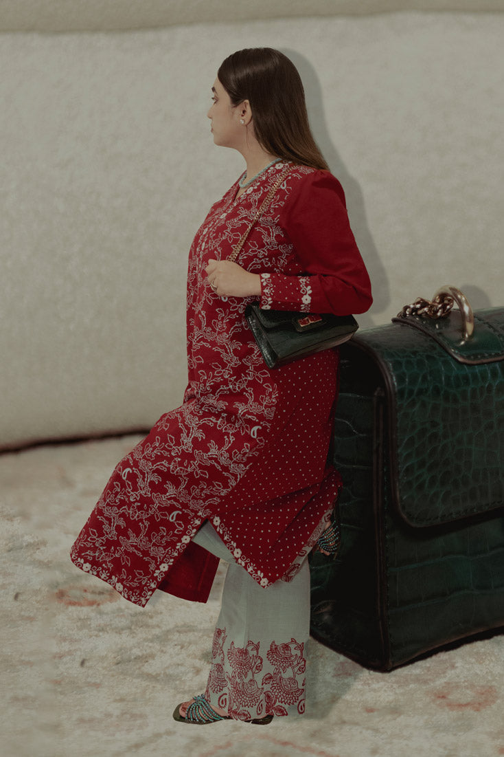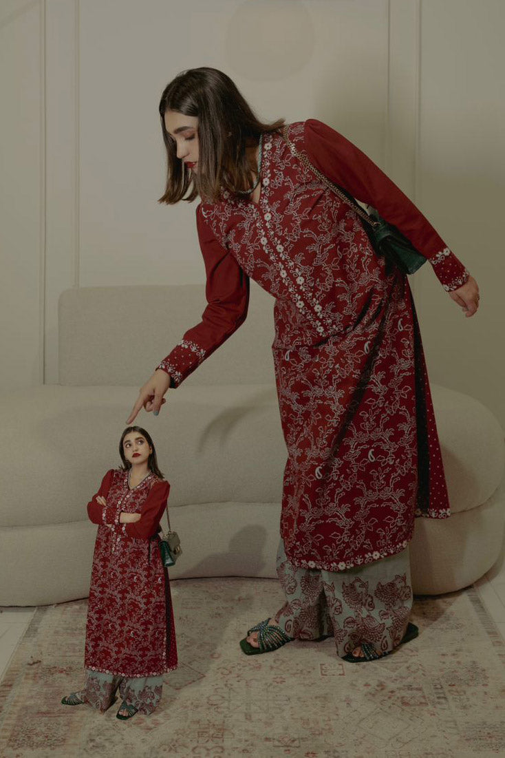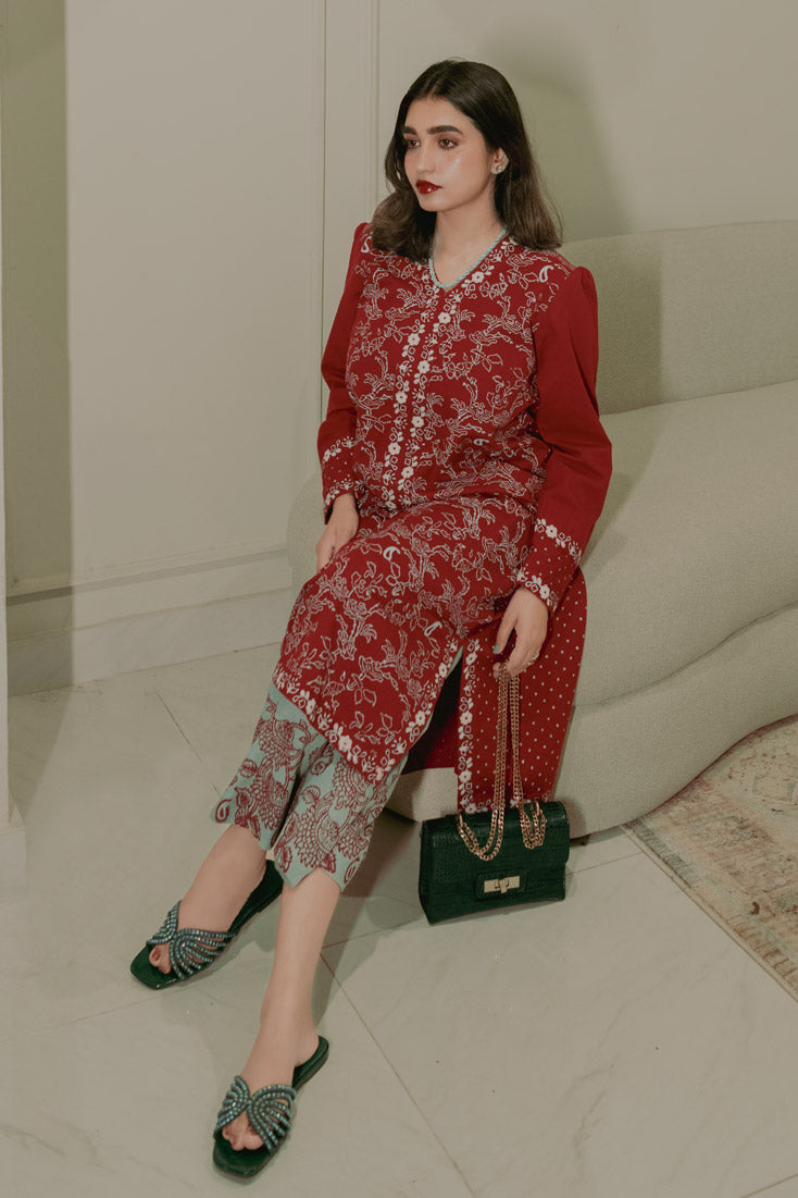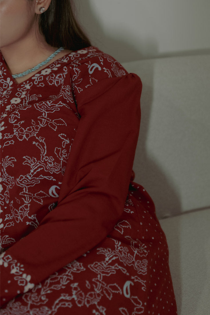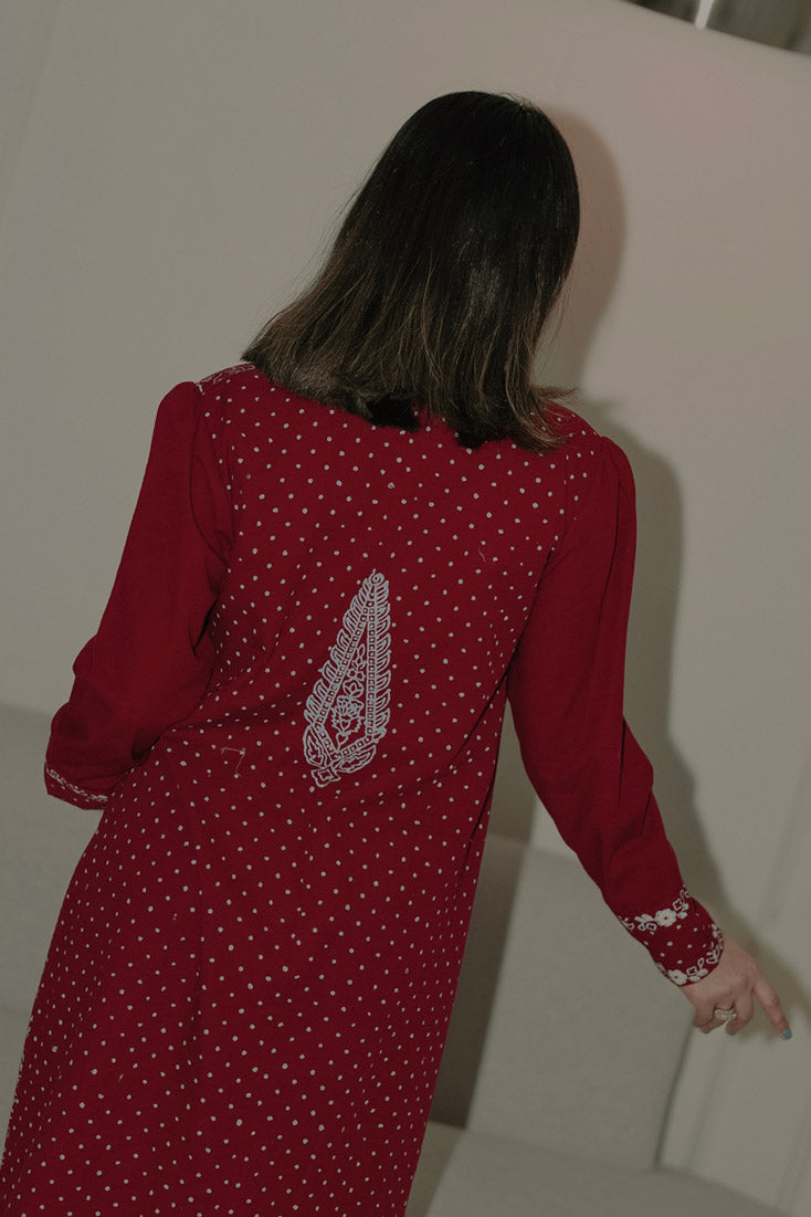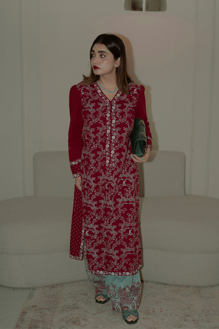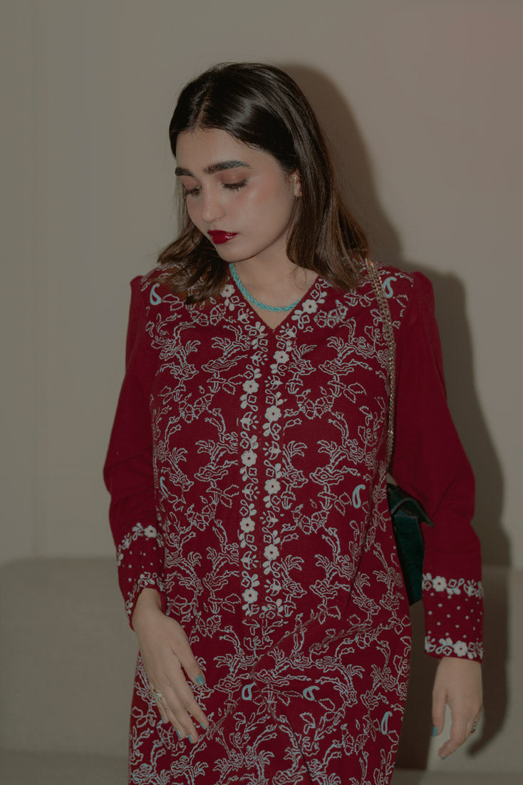 Description: Make a statement this winter with our exquisite maroon Hand block-printed kaftan. Featuring unique front and back prints, balanced design placement, and intricate borders adorning the cuffs, neckline, and hem. Paired with wide-hem pants showcasing a contrasting block-printed border, this ensemble is perfect for those who dare to be different.