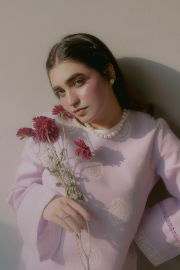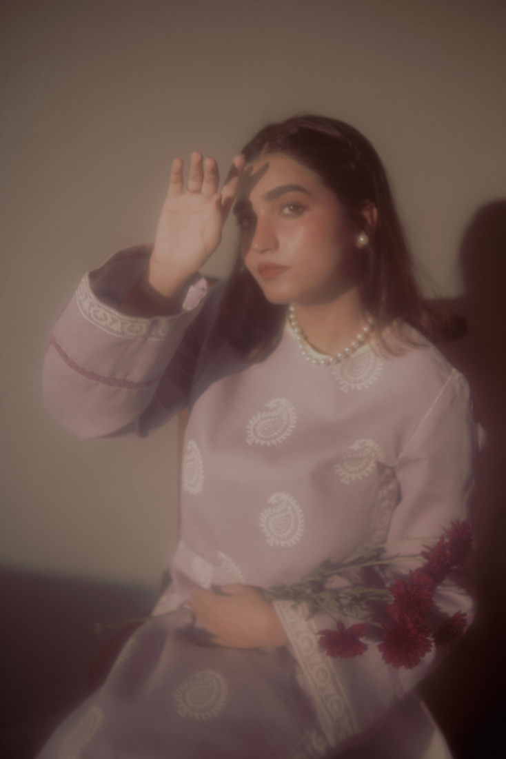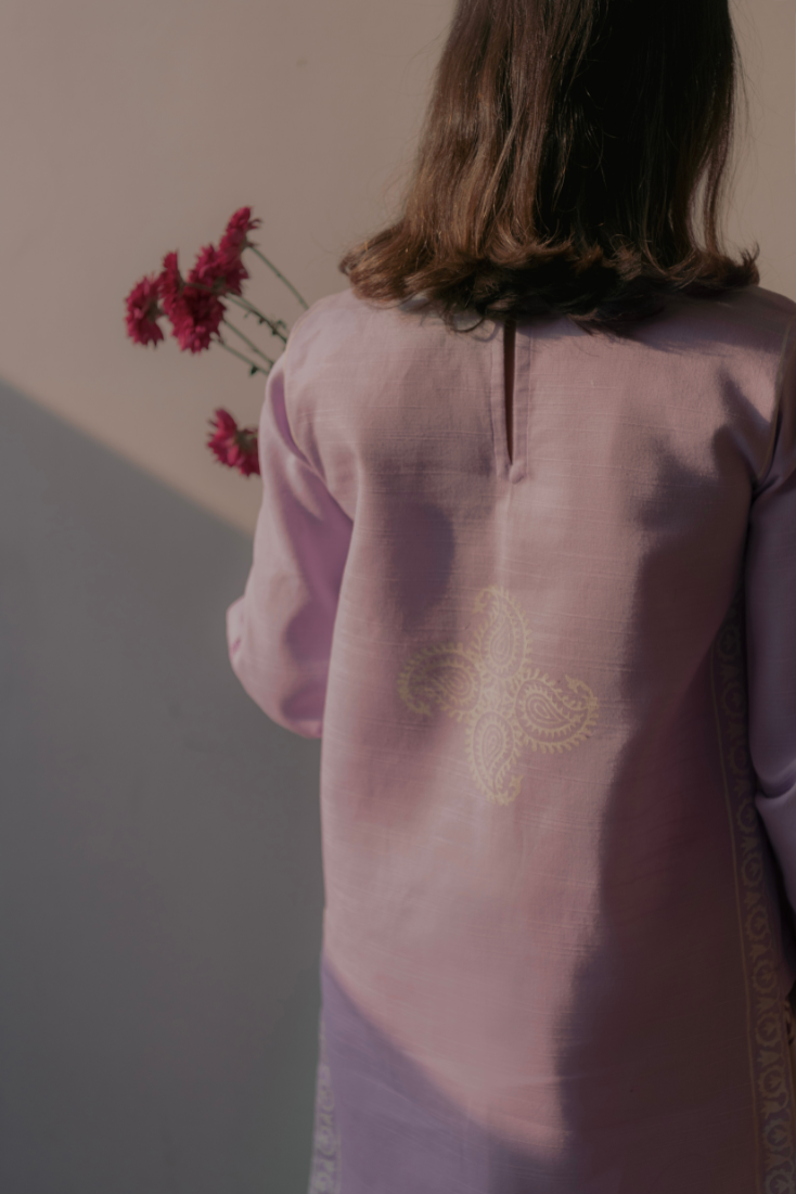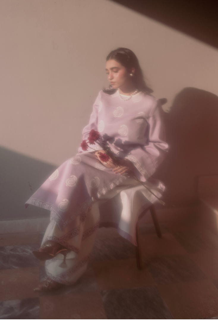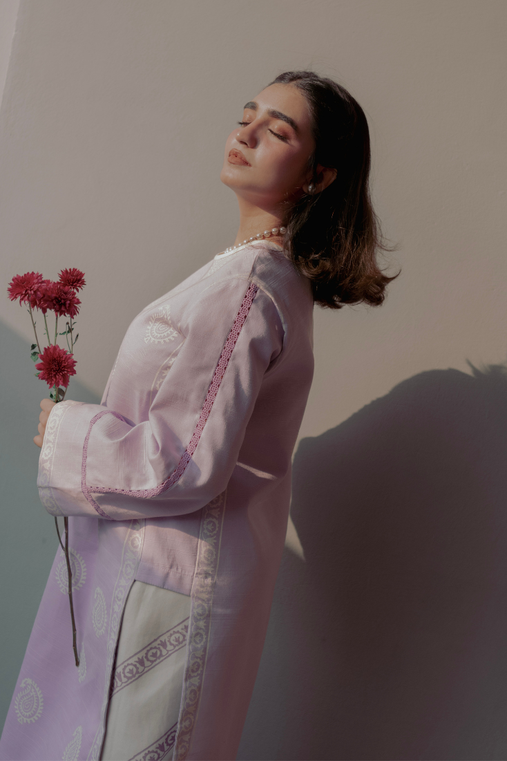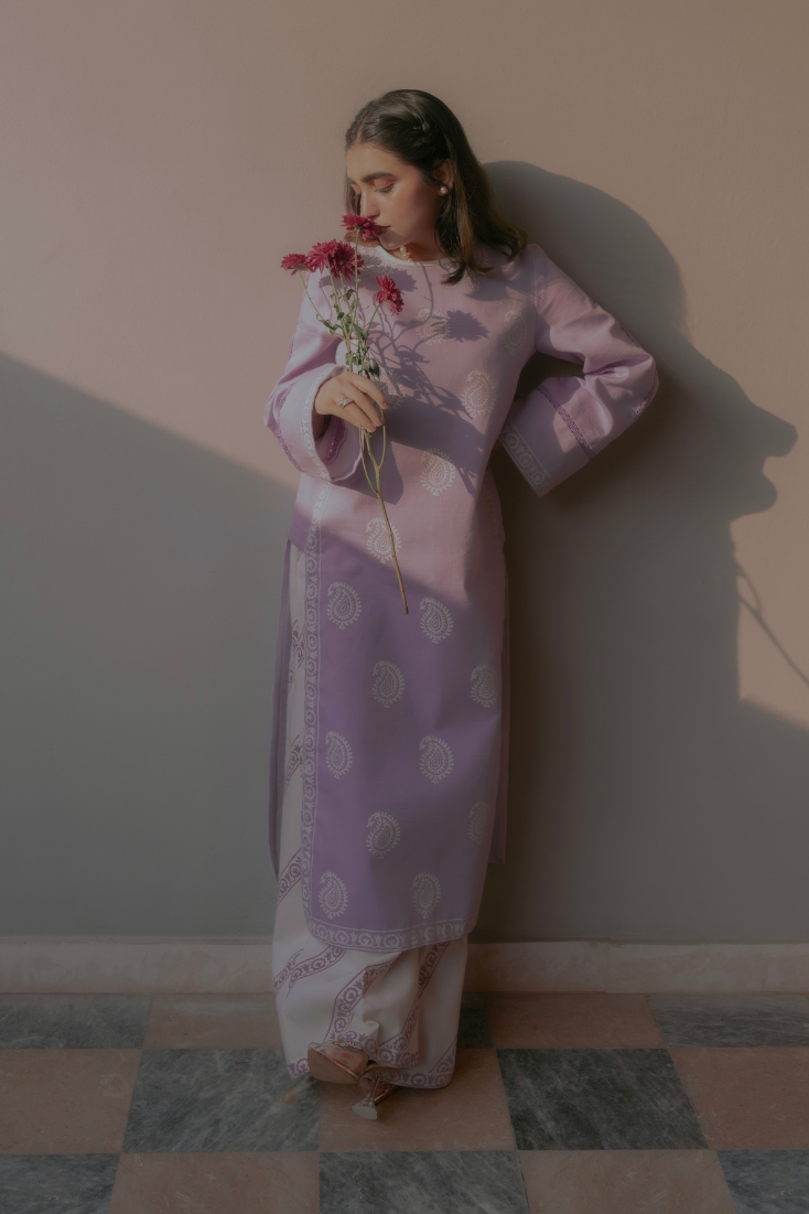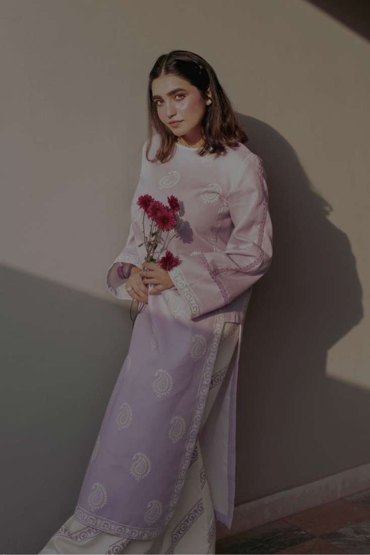 Description:Elevate your winter wardrobe with our exquisite Lavender Khaddar ensemble, featuring intricate hand-block printed designs. The long shirt boasts a beautiful Paisley block print on the front and back, complemented by a delicate Hamd block-printed border on the choke, borders, and sleeves hem. Adorned with lace details on the sleeves and back opening, this piece is a true masterpiece. Paired with hand-block printed wide-leg pants featuring diagonal lines and a printed hem, this outfit is perfect for making a statement this winter season.